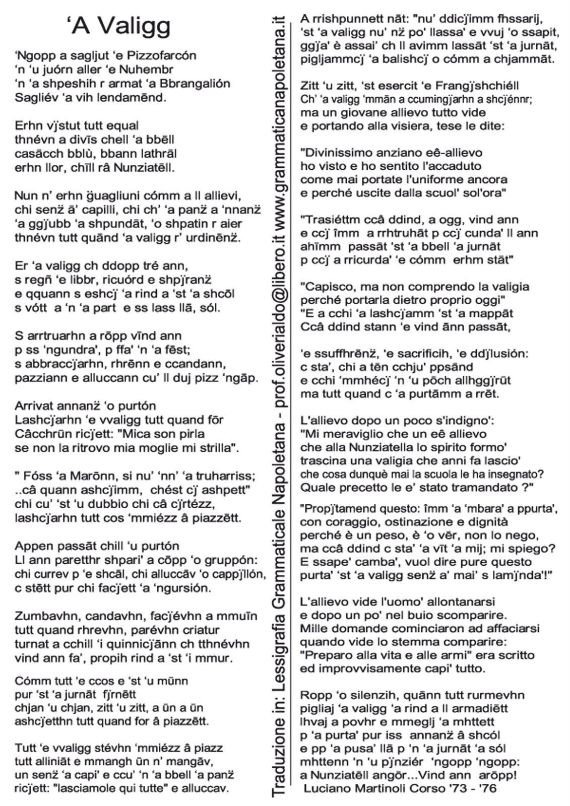 Questo Blog offre la possibilità di vedere tradotte in lessigrafia grammaticale napoletana, ossia in LINGUA NAPOLETANA le poesie classiche di noti Autori, ma offre anche l'opportunità a moderni autori, poeti napoletani dei nostri tempi, di vedere pubblicata in questo blog, tradotta in LESSIGRAFIA GRAMMATICALE NAPOLETANA la propria Poesia, partecipando così a questo progetto di conoscenza e divulgazione della NUOVA E STRAORDINARIA SCOPERTA SCIENTIFICO LETTERARIA DEL PROF. ALDO OLIVERI.